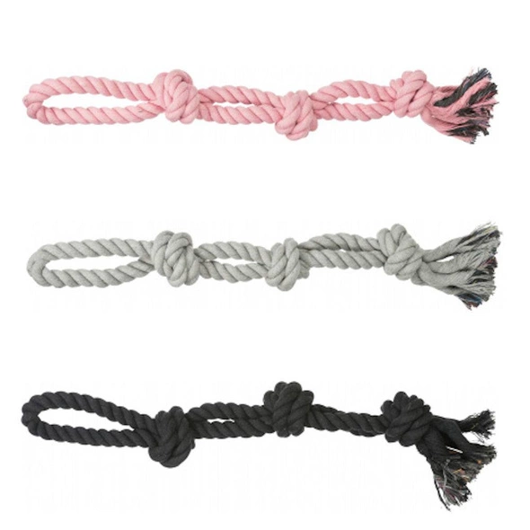 - Zabawka wykonana jest z plecionego, kolorowego i bardzo wytrzymałego sznura.Specjalny splot i naturalny materiał sprawiają, że sznur ma właściwości oczyszczające zęby psa z osadu, co zapobiega powstawaniu kamienia nazębnego oraz zapaleniu dziąseł.
