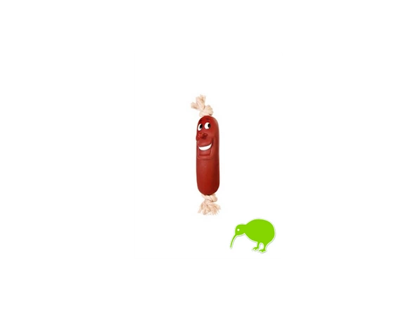 Kiełbaska ze sznurkiem wystającym z dwóch końców jest wspaniałą zabawką dla Twojego psa.