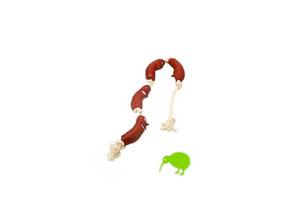 Kiełbaska ze sznurkiem wystającym z dwóch końców jest wspaniałą zabawką dla Twojego psa.