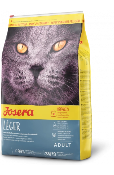 - Josera Léger ze zredukowaną zawartością tłuszczu i zwiększonym poziomem włókna jest właściwą karmą dla mało aktywnych kotów oraz dla kotów z nadwagą, np. po zabiegu kastracji lub sterylizacji.