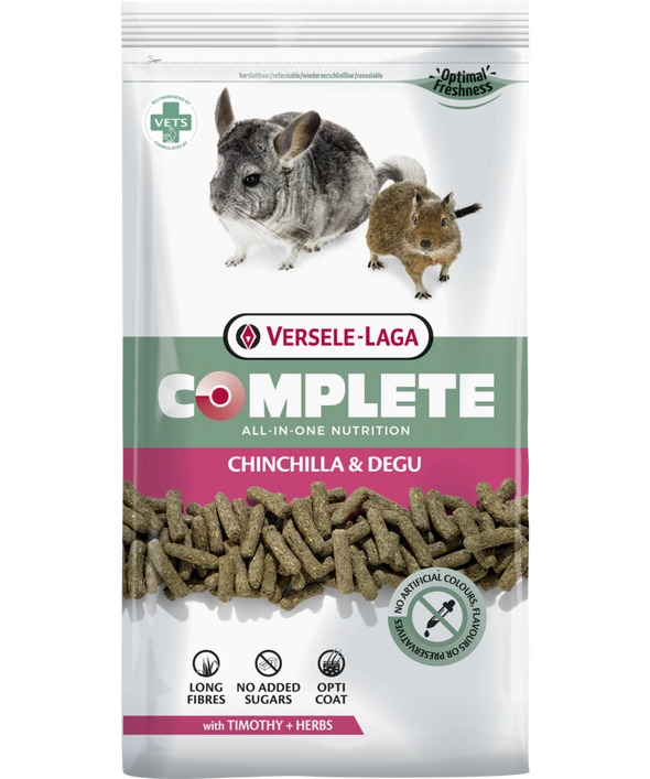 Versele-Laga Complete Chinchilla & Degu to ekstrudowana, wysokobłonnikowa karma przygotowana w koncepcji "wszystko w jednym", która zapobiega selektywnemu pobieraniu pokarmu. Dzięki temu każde zwierzę otrzymuje wszystkie niezbędne składniki odżywcze wspierające zdrowie i witalność. Receptura została opracowana przez lekarzy weterynarii i dostosowana do potrzeb szynszyli oraz koszatniczek. Karma nie zawiera cukru, a obecność siemienia lnianego dostarcza kwasów omega-3, dbających o zdrową i lśniącą sierść. Długie włókna wspierają prawidłowe trawienie i naturalne ścieranie zębów.