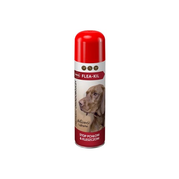 Pess Flea-Kil Spray to bard rozprzestrzenizo skuteczny i szybki sposób na pozbycie się insektów z pomieszczeń mieszkalnych. Spray zwalczający wszelkie owady biegające takie, jak mrówki, pająki, pchły, wszy oraz kleszcze. Jego działanie oparte na alkoholowym roztworze tetramertyny i permetryny. To substancje chemiczne działające neurotoksycznie na insekty, w momencie kontaktu paraliżują ich układ nerwowy. Są one jednocześnie bezpieczne dla psów i ludzi. Niezwykle przydatny w każdym domu, w którym mieszkają psy wychodzące, mogące przynieść na sobie niechcianych lokatorów. Gdy zauważysz owady w otoczeniu, możesz szybko zareagować i zapobiec zasiedleniu domu przez szkodniki.