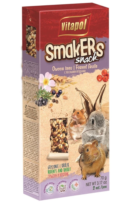Smakers stanowi urozmaicenie i uzupełnienie diety gryzoni i królików. Bogaty w wiele witamin, minerałów i pektyn, których źródłem są dojrzałe, najlepszej jakości owoce takie jak dzika róża, jałowiec, jarzębina, czarny bez i porzeczka. Dzika róża to bogactwo witaminy C, zawiera również witaminy: A, B1, B2,E, K, flawonoidy, garbnik oraz kwasy organiczne. Jarzębina działanie moczopędne, przeciwzapalne na błony śluzowe jelit i żołądka oraz łagodzi podrażnienia wątroby. Smakers idealny dla zwierząt, których dieta wymaga dostarczenia zwiększonych ilości witaminy C (np.kawia domowa).
