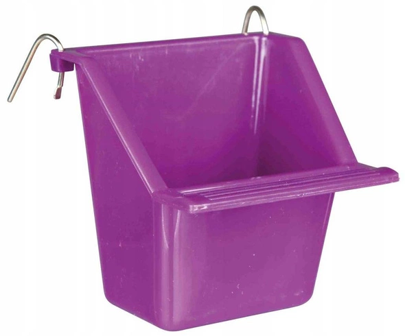Zawieszane na m.in. prętach klatki. Podwyższony jeden z brzegów pojemniczka (ten od strony ścianek klatki) ogranicza wysypywanie pokarmu poza klatkę.