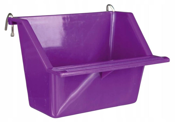 Zawieszane na m.in. prętach klatki. Podwyższony jeden z brzegów pojemniczka (ten od strony ścianek klatki) ogranicza wysypywanie pokarmu poza klatkę.