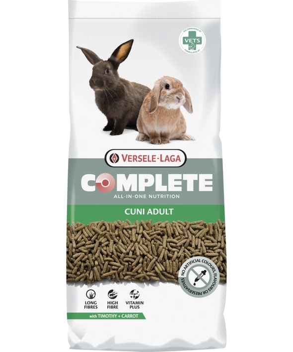 Versele-Laga Cuni Complete Adult to wysokiej jakości, ekstrudowana karma dla dorosłych królików, opracowana przez zespół lekarzy weterynarii i dietetyków zwierzęcych. Koncepcja „all-in-one” (wszystko w jednym) zapobiega wybieraniu ulubionych składników, dzięki czemu każdy granulat dostarcza królikowi kompletu niezbędnych substancji odżywczych, błonnika, witamin i minerałów.