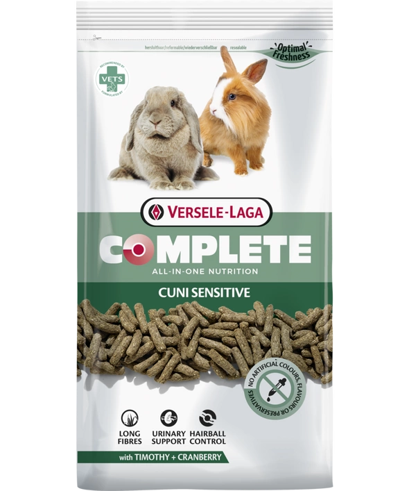 Versele-Laga Cuni Sensitive Complete to karma klasy premium dla królików wymagających delikatnego podejścia do żywienia. Dzięki obniżonej kaloryczności, żurawinie i wysokiej zawartości włókna wspiera zdrowie układu pokarmowego, moczowego i jamy ustnej, zapewniając codzienną równowagę i witalność. 🐰🌿
