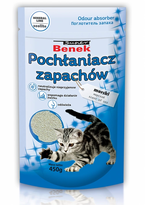 Pochłaniacz zapachów oparty na bazie zeolitu, całkowicie neutralizuje nieprzyjemne zapachy pojawiające się w kuwecie. Posiada przyjemny, morski zapach. Ogranicza rozwój bakterii i grzybów zapewniając czystość i higienę kociej toalety. Charakteryzuje się wysoką zdolnością wchłaniania powstającej wilgoci. Pochłaniacze zapachów to grupa wyrobów pokrewnych neutralizatorom, spełniająca podobne funkcje tj. poprawa parametrów użytkowych żwirków higienicznych oraz usuwanie zanieczyszczeń pozostawionych przez zwierzęta. Doskonale adsorbują nieprzyjemne zapachy, dbając jednocześnie o szeroko pojętą higienę w kuwecie i wokół niej. Dostępne w poręcznych opakowaniach foliowych ze struną umożliwiającą zamknięcie preparatu w okresach pomiędzy jego stosowaniem. Pochłaniacze to produkty uniwersalne przeznaczone do stosowania z wszystkimi rodzajami żwirków.