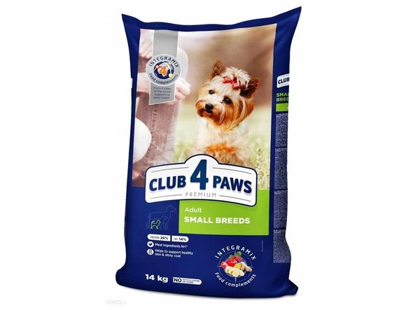 Club 4 łapy dla dorosłych psów małych ras 14 kg to pełnoporcjowa sucha karma premium zawiera w swoim składzie na pierwszym miejscu składniki mięsne i zbilansowaną formułę z wysoką zawartością kurczaka (29%), świetnie smakuje psom małych ras o masie do 10 kg i w wieku od 1. roku życia. Karma jest wzbogacona w kompleks Omega 3 + Omega 6 utrzymujący zdrową skórę i błyszczącą sierść i w formułę ІNTEGRAMIX dla ogólnego wsparcia zdrowia ulubieńca.
