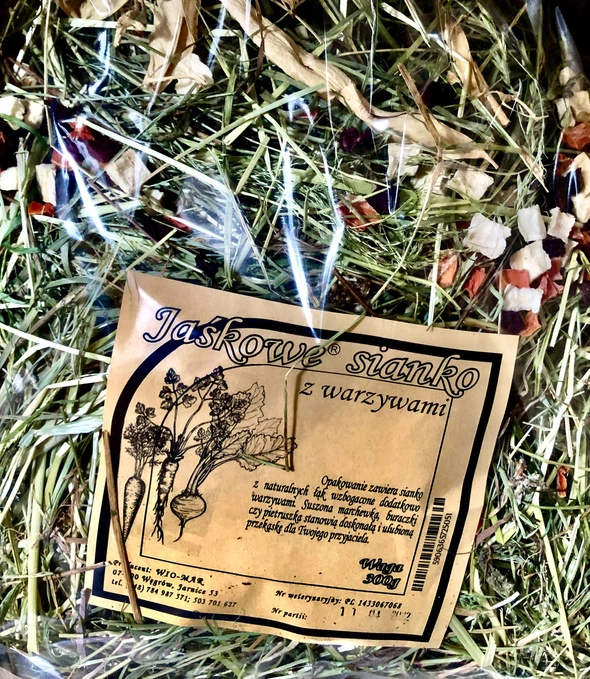 Zawiera sianko z naturalnych łąk wzbogacone dodatkowo warzywami i kwiatami. Suszona marchewka, buraczki czy pietruszka oraz kwiaty z polnych łąk stanowią doskonałą i ulubioną przekąskę dla Twojego przyjaciela.