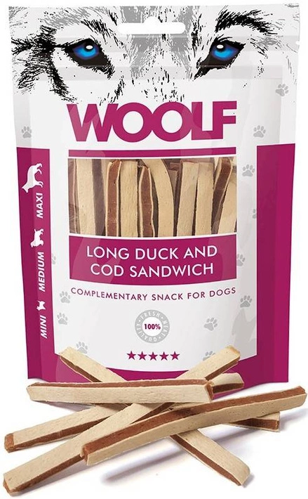 Woolf Long Duck and Cod Sandwich oczaruje podniebienie twojego czworonoga wyjątkowym połączeniem kaczki z rybą. Miękkie, smakowite paseczki mogą stanowić świetną przerwę od psich harców i szaleństw urozmaicając codzienność.