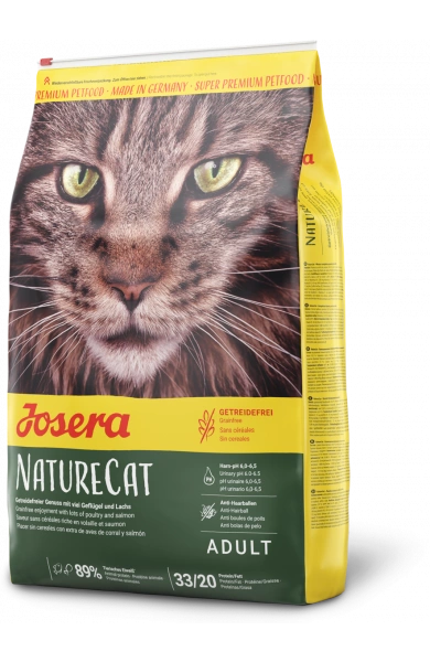 - Bezzbożowa karma sucha z drobiem i łososiem przeznaczona dla dorosłych kotów.