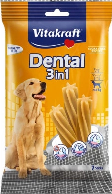 Oryginalny kształt smakołyku ułatwia dbanie o higienę jamy ustnej.  Unikalny, przysmak w kształcie sześcioramiennej gwiazdy, sprawia iż przysmak Vitakraft Dental 3w1 zapewnia i ułatwia dokładne czyszczenie zębów, wspiera usuwanie osadu i zapobiega odkładania się kamienia nazębnego. Dzięki specjalnemu kształtowi dodatkowo masuje dziąsła psa. Cynk przeciwdziała zapaleniu dziąseł i przyczynia się do gojenia ran w pysku. Gryzak dba o zęby czyszcząc je mechanicznie i pomagając ograniczyć powstawanie kamienia nazębnego.