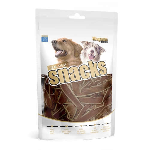 MAGNUM Paski z kaczki i dorsza to przysmak stworzony z myślą o psach, które kochają intensywny smak mięsa, ale potrzebują lekkiej i dobrze przyswajalnej formuły. Te 100% naturalne paski łączą w sobie delikatną kaczkę i wartościowego dorsza – idealne do treningu, jako nagroda lub przekąska w podróży.