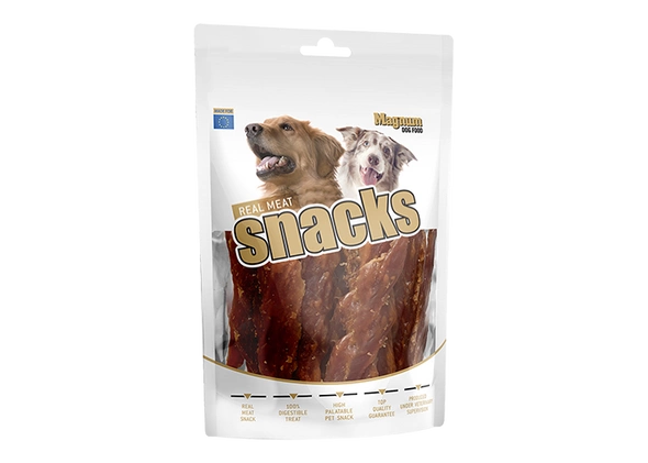 MAGNUM Miękka pierś z kaczki to wyjątkowo smakowity przysmak z czystego, suszonego mięsa kaczki – w miękkiej, elastycznej formie. Idealny jako nagroda po treningu, smaczne uzupełnienie diety w podróży lub sposób na okazanie psu miłości. Bez obciążania organizmu, za to z dużą dawką białka.