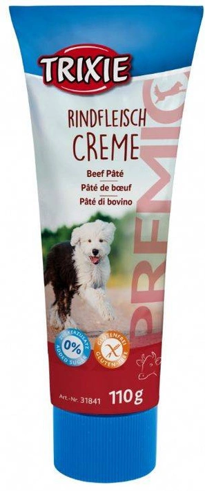 Trixie przysmak Premio pasztet z wołowiny, w tubce, to doskonały dodatek bezglutenowy do codziennej diety Twojego psa. W tym przysmaku została obniżona zawartość soli oraz przypraw. Ma wyjątkowy smak, aromat oraz bardzo delikatną konsystencję. Pasztet ma uniwersalne zastosowanie: jako dodatek do karm, jako nagroda i przekąska, doskonały w celu zachęcania do przyjmowania leków, tabletek, karm oraz preparatów specjalistycznych. Szczególne polecany dla wybrednych psów. Może służyć jako nadzienie do zabawek na przysmaki dla psa.