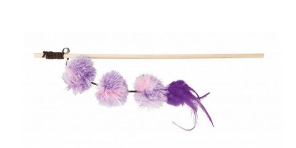 Wędka zakończona jest materiałowymi pomponami aromatyzowanymi walerianą, dzwoneczkiem i piórkiem.