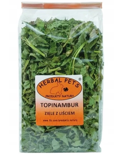 Topinambur - ziele z liściem- to roślina o wysokiej zawartości błonnika, usprawniająca przemianę materii, regulująca prawidłową mikroflorę w jelitach, a także wspomagająca proces odchudzania. Topinambur wspomaga obniżanie poziomu stężenia glukozy i cholesterolu we krwi. Topinambur to roślina zalecana koszatniczkom -zwierzętom podatnym na cukrzycę. Topinambur można podawać również jako dodatek do diety dla: królika, szynszyli, świnki morskiej / kawii domowej, szczura, myszoskoczka i chomika.