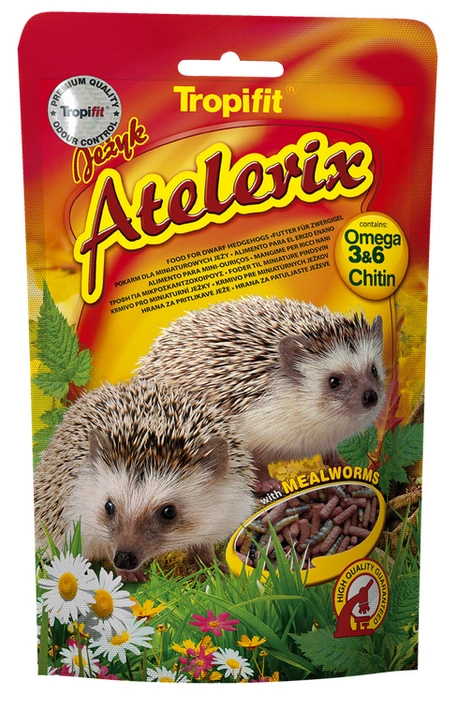 Atelerix to kompletna karma z kurczakiem i dodatkiem suszonych larw mącznika młynarka dla afrykańskich jeży pigmejskich oraz jeży białobrzuchych, uszatych, algierskich, południowoafrykańskich, somalijskich i innych. Odpowiednio zbilansowany skład, zawierający m.in. łatwostrawne białko z kurczaka, zapewnia jeżykom doskonałą kondycję oraz dużą dawkę energii potrzebnej do poznawania świata. Zastosowany w pokarmie olej z łososia jest źródłem kwasów Omega-3 i Omega-6, które wpływają pozytywnie na kondycję skóry jeży. Naturalny immunostymulator beta-glukan oraz stabilizowana witamina C wzmacniają odporność jeżyków na choroby. Chityna pochodząca z naturalnych źródeł (skorupek krewetek oraz larw mącznika młynarka) reguluje pracę przewodu pokarmowego. Wielkość i struktura granulek dostosowane są do małych szczęk i niewielkich ząbków jeżyków.