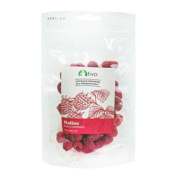 Malina liofilizowana. Bez cukru, bez konserwantów, bez sztucznych barwników. Naturalny smak, aromat i kolor.