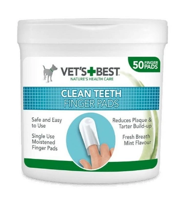 Większość Pupili nie przepada za zabiegami pielęgnacyjnymi. Ciężko jest im wytłumaczyć, że to wszystko robimy dla ich dobra. Jednak, wychodząc na przeciw potrzeb naszych czworonożnych przyjaciół, firma Vet's Best stworzyła preparat do czyszczenia jamy ustnej w formie chusteczek nakładanych na palec. Są szybkie i łatwe w użyciu. Poprzez regularne masowanie dziąseł i zębów za pomocą nakładek, nie tylko zadbasz o świeży oddech swojego Pupila, ale i zapobiegniesz powstawaniu kamienia nazębnego.