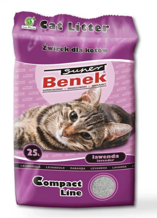 - Super Benek Compact Lawenda 25 L - Bentonitowy żwirek dla kota o zapachu lawendy, który pozostawia przyjemny i odświeżający aromat wokół kociej toalety.
