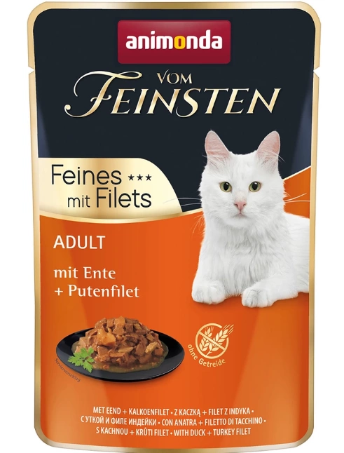 Vom Feinsten Adult z kawałkami filetów to zbilansowane, pyszne i zdrowe pożywienie na najwyższym poziomie dla dorosłych kotów w wieku od 1 do 6 lat.