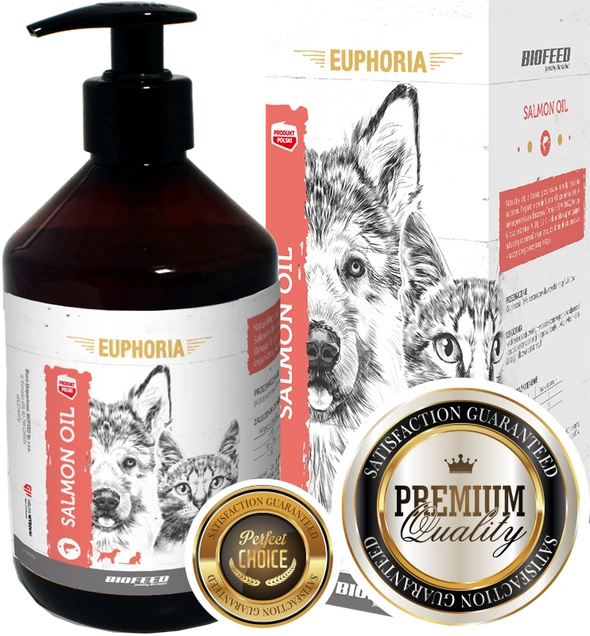 Naturalny olej z łososia dla psa i kota, pozyskiwany metodą tłoczenia na zimno. Uzupełnia dietę w nienasycone kwasy tłuszczowe Omega 3 (EPA< DHA), Omega 6 oraz witaminy: A, D3, E i K. Wspomaga naturalną odporność organizmu. Oferowany olej z łososia to produkt z półki premium. Jest wytwarzany w Polsce. Nie zawiera sztucznych dodatków, barwników czy konserwantów. Dzięki ciemnej butelce jest izolowany od światła słonecznego i dłużej zachowuje swoje właściwości.