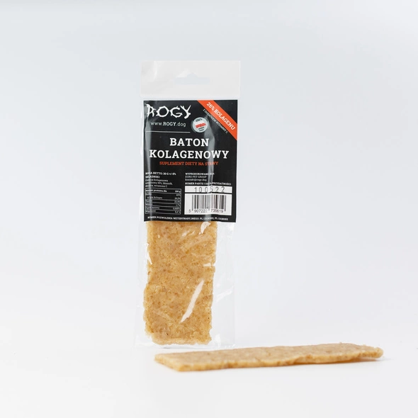Baton kolagenowy to gryzak dedykowany wszystkim psom. Oprócz funkcji dostarczania do organizmu cennego kolagenu, spełnia również funkcje dentystyczną. Podczas gryzienia doskonale usuwa płytkę nazębną. Suplementacja kolagenu przez młode psy powoduje wzmocnienie rozwijającej się chrząstki stawowej, a co za tym idzie ogranicza możliwość zwyrodnienia układu ruchowego spowodowanego szybkim wzrostem lub dużą masą ciała. W przypadku psów starszych oraz o wysokiej aktywności, regularna suplementacja kolagenu chroni stawy oraz cały układ ruchu przed uszkodzeniami. Ma również pozytywny wpływ na kości, skórę, sierść i pazury psa. Baton wzbogacony jest o witaminę C, która ułatwia prawidłowe przyswajanie kolagenu przez organizm zwierzęcia. Jeden baton zawiera około 10 gramów kolagenu. Zalecana dawka dzienna to 1 gram na 5 kilogramów masy ciała psa. Kolagenu nie można przedawkować.