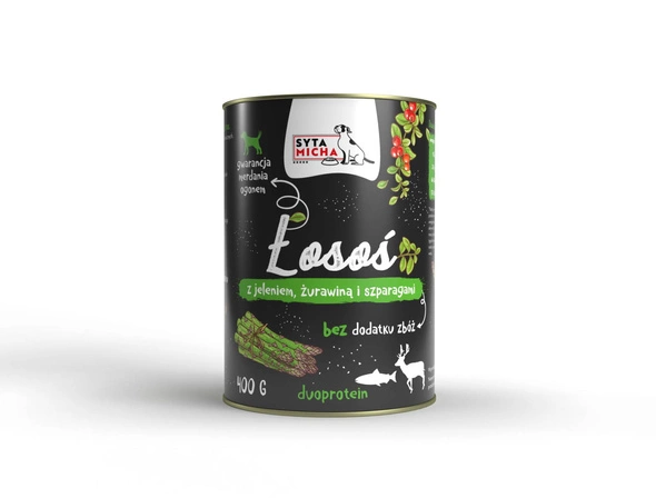 - Syta Micha Łosoś z jeleniem, żurawiną i szparagami 400g - bezzboźowa mokra karma dla dorosłego psa
