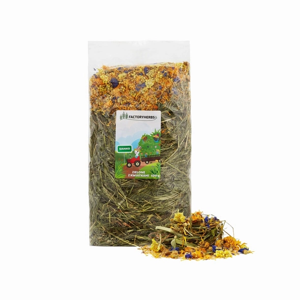 FactoryHerbs Zielone sianko z kwiatkami to wyjątkowy produkt, który zachwyca intensywnie zielonym kolorem i wspaniałym aromatem. Dzięki specjalnej metodzie suszenia na profesjonalnej suszarni, zachowuje maksimum wartości odżywczych, świeżość oraz naturalny zapach, który przyciągnie nawet najbardziej wybredne zwierzęta.