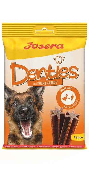 Marchew jest znana z tego, że zawiera wiele ważnych witamin. Josera Denties zawierają więc sporą porcję tego smacznego warzywa w połączeniu z pyszną kaczką. Ale mogą one zrobić o wiele więcej: dzięki swojej strukturze w kształcie gwiazdy mogą pomóc Twojemu psu w codziennej pielęgnacji zębów. Podczas gdy on żuje je z przyjemnością, dziąsła są delikatnie masowane, a dodatkowo redukuje uciążliwą płytkę nazębną.
