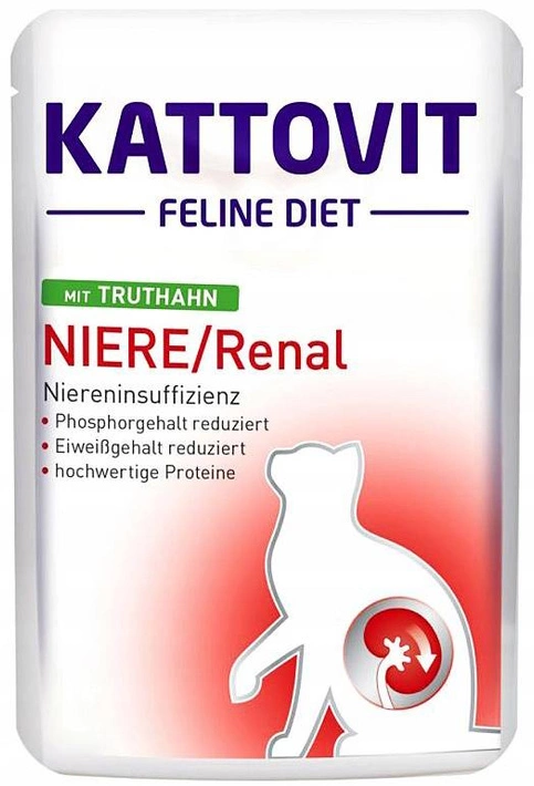 Kattovit Renal w saszetkach to specjalistyczna karma dla kotów cierpiących na choroby nerek, które mogą być spowodowane obecnością innych chorób, nieprawidłowym prowadzeniem hodowli, niekorzystnym wpływem środowiska czy nieprawidłowym żywieniem. W zapobieganiu chorobom nerek pomocne jest przyjmowanie odpowiedniej ilości płynów. U zwierząt z tendencją do chorób nerek pożywienie o zbyt wysokiej zawartości białka może przyczyniać się do niewydolności nerek. Dlatego karma Kattovit Renal zawiera obniżoną ilość białek, wystarczającą do pokrycia zapotrzebowania energetycznego. Karma zapewnia optymalną ilość kalorii, niepochodzących ze źródeł zwierzęcych. Cytrynian potasu pomaga utrzymać neutralną wartość pH moczu, co pomaga zapobiegać powstawaniu kamieni moczowych (kamieni i kryształków szczawianowych). Zawartość fosforu i sodu również została zredukowana. Egzogenna tauryna i inne ważne witaminy i minerały sprawiają, że karma posiada zbilansowany profil żywieniowy, dzięki czemu karma dostarcza do organizmu Twojego kota wszystko, czego Twój pupil potrzebuje, aby wieść aktywne i witalne życie.