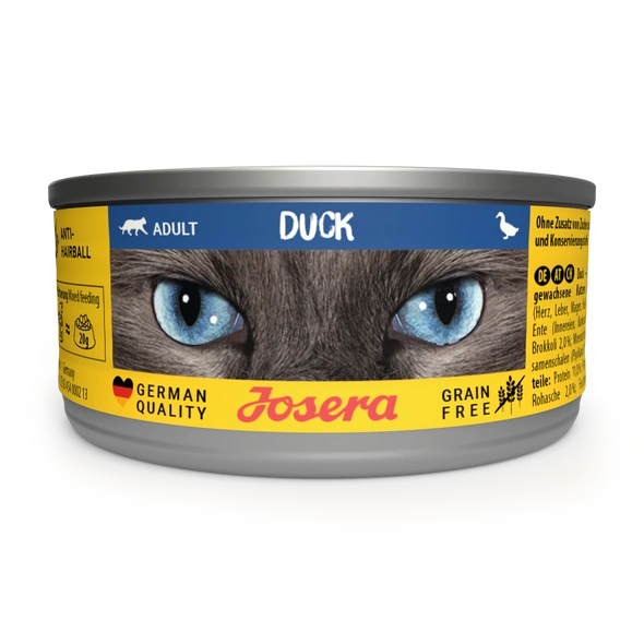 Gdy pupil je posiłek ze smakiem, jego opiekun też jest zadowolony. To kolejny powód, aby zadbać o pyszne urozmaicenie diety – na przykład wybierając naszą nową mokrą karmę Josera Duck w puszcze! Smak kaczki zachęci do jedzenia nawet wybredne koty. Karma Duck w puszcze dostarcza kotom większą dawkę płynów, co jest cenne dla kotów, które niechętnie piją wodę.