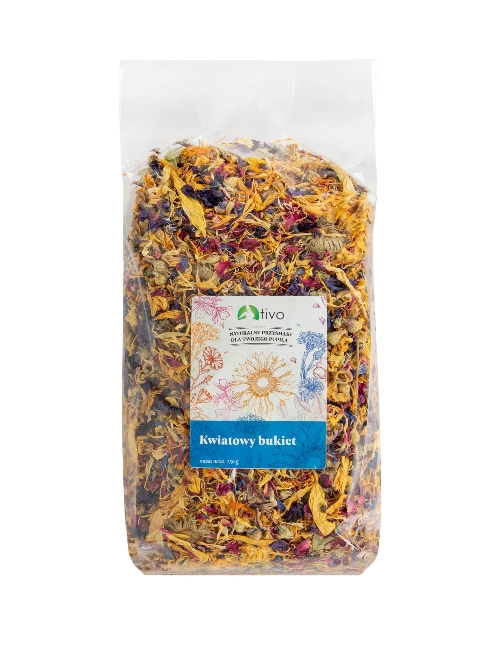 Jest to kolorowa mieszanka kwiatowa, w której składzie znajdują się nagietek, płatek róży, bławatek, płatek słonecznika, ślaz oraz nowy składnik - kwiat kocanki piaskowej.