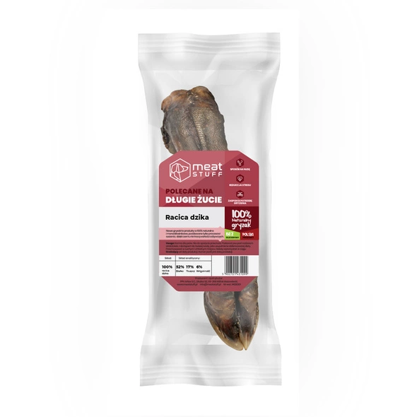Racica dzika to naturalny, tłusty gryzak, który zapewni dłuższe zajęcie Twojemu psu. Składa się z kości, ścięgna, skóry, chrząstek i kopytka posiada bardzo charakterystyczny zapach i smak dla psa. Wielką zaletą jest sposób jego przygotowania, podczas którego nie użyto chemicznych konserwantów i dodatków smakowych, przez co racica zachowuje swoje naturalne walory smakowe i zapachowe. Będzie stanowić aromatyczną i pożywną przekąskę, którą zainteresują się nawet najbardziej wybredne i wymagające psy. Pomaga w czyszczeniu zębów, masowaniu dziąseł, oraz zaspokaja naturalną potrzebę gryzienia. Polecany dla średnich i większych psów, oraz dla psów z silną pot gryzienia. Dobrze sprawdzi się jako nagroda lub sposób na zajęcie psa podczas wizyty gości.