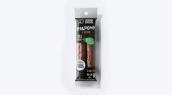 - Wyjątkowo smaczny przysmak z grubo siekanego i delikatnie podsuszanego mięsa z dzika w kształcie palucha.