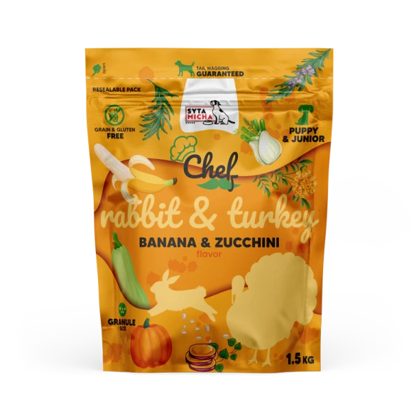- Karma sucha dla szczeniąt i juniorów Królik i indyk, banan i cukinia.