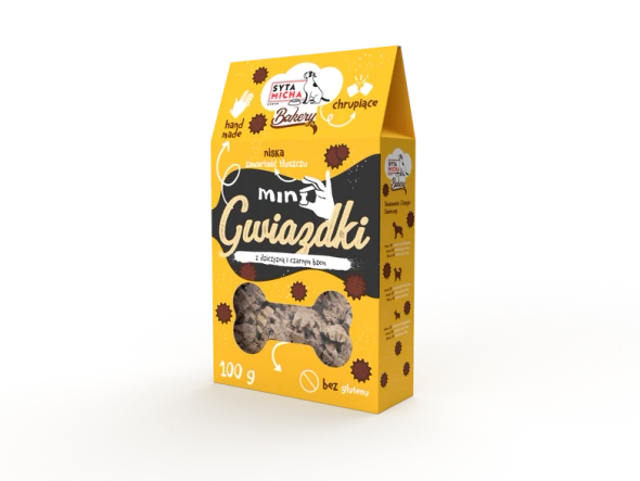 Mini gwiazdki to ręcznie robione, pieczone ciastka dla psa. Nieprawdopodobnie chrupiące, malutkich rozmiarów przekąski, których skład bazuje na dziczyźnie bogatej w białko i żelazo i owocach czarnego bzu będącego źródłem witaminy C i witaminy A, o właściwościach przeciwwirusowych i immunomodulujących. Wśród innych prozdrowotnych dodatków, w mini gwiazdkach znajdziemy celulozę, kminek, tymianek i drożdże.