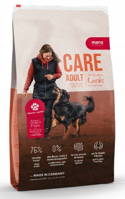 MERA CARE Adult Salmon to kompletna karma dla dorosłych psów o normalnym poziomie aktywności z pysznym smakiem łososia.