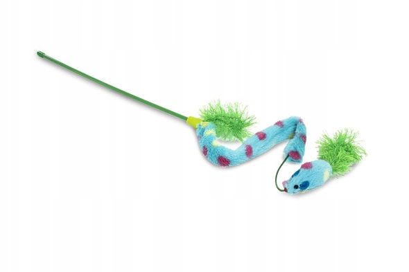 Wędka dla kota z pluszową niebieską myszką.