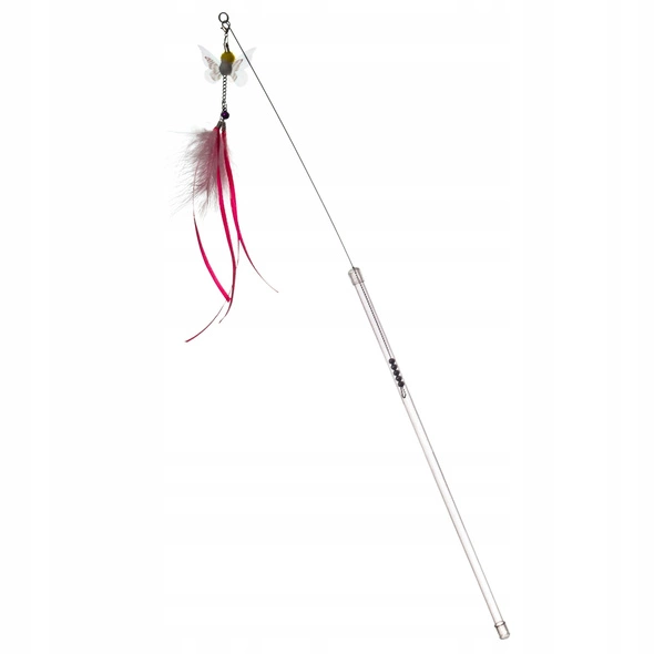 Wędka teleskopowa butterfly pink ze stylowym uchwytem i piórkami z motylkiem na druciku, do zabawy z kotem.