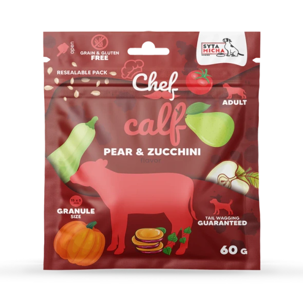 Syta Micha Cielęcina, gruszka i cukinia to bezzbożowa, monoproteinowa i pełnoporcjowa formuła dla każdego dorosłego psa. To odpowiednio zbilansowany posiłek, w którym na pierwszym miejscu znajdziemy aż 60% mięsa cielęcego, doskonałego źródła białka, niezbędnego dla utrzymania masy mięśniowej i prawidłowej masy ciała.