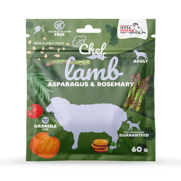 - Próbka karmy suchej dla dorosłego psa Jagnięcina, szparagi i rozmaryn.