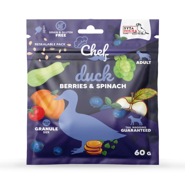 - Próbka karmy suchej dla dorosłego psa Kaczka, jagody i szpinak.