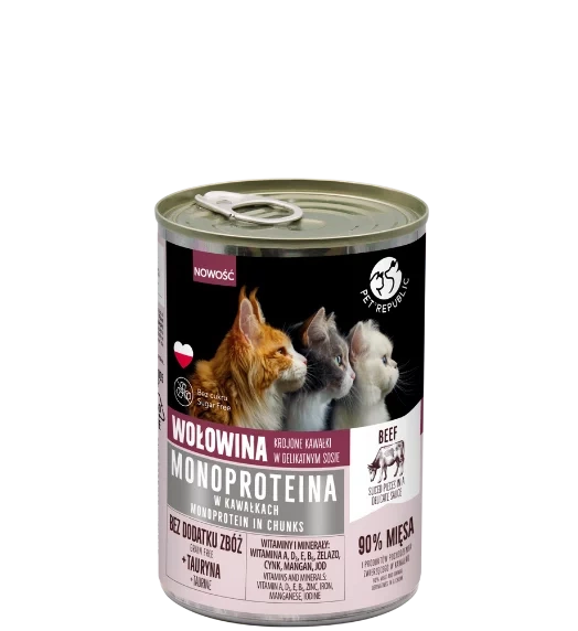 Smak i jakość schowane w jednej puszce! Niech Twój kot rozsmakuje się w soczystych monoproteinowych kawałkach zanurzonych w delikatnym sosie. Karma przygotowana z najwyższą starannością w centrum Polski, z najlepszej jakości, świeżych surowców mięsnych z wołowiny. Bogata w składniki odżywcze oraz witaminy zapewni Twojemu kotu zdrowy, pełnoporcjowy posiłek na cały dzień!