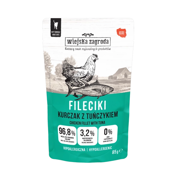 WIEJSKA ZAGRODA – KARMA MOKRA DLA KOTA – FILECIKI KURCZAK Z TUŃCZYKIEM 85g