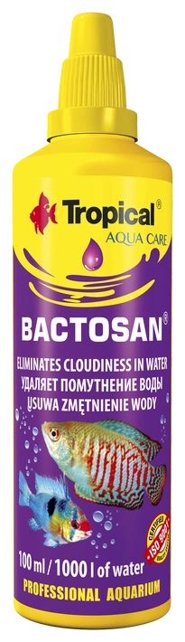 • Tropical Bactosan przeznaczony jest do klarowania wody akwariowej, która uległa zmętnieniu na przykład w wyniku złego funkcjonowania filtracji, na skutek przekarmienia ryb lub braku równowagi biologicznej w nowo założonych zbiornikach