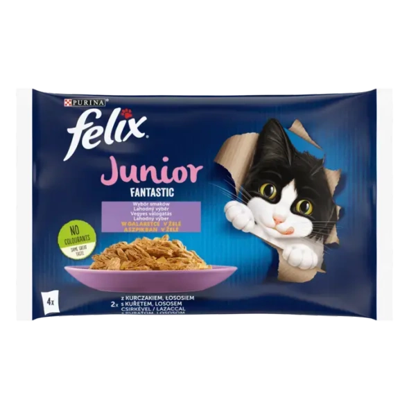 Felix Fantastic Junior to pełnoporcjowa, zbilansowana karma mokra w galaretce, stworzona specjalnie z myślą o kociętach w pierwszym roku życia. Zawiera białko, witaminy i minerały wspierające prawidłowy rozwój mięśni, kości i zębów. Receptura doskonale sprawdza się także u kotek ciężarnych i karmiących oraz kotów po sterylizacji.