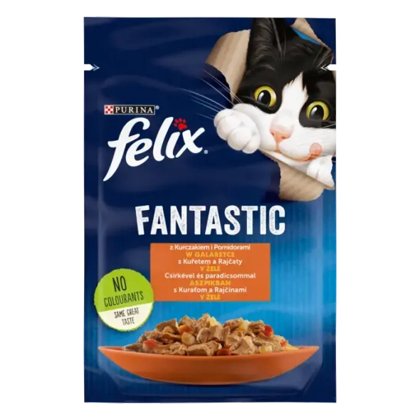 Felix Fantastic z kurczakiem i pomidorami to pełnoporcjowa, zbilansowana karma mokra dla dorosłych kotów. Delikatne kawałki mięsa w aromatycznej galaretce z dodatkiem pomidora dostarczają energii, witamin i smaku, któremu nie oprze się żaden mruczek.